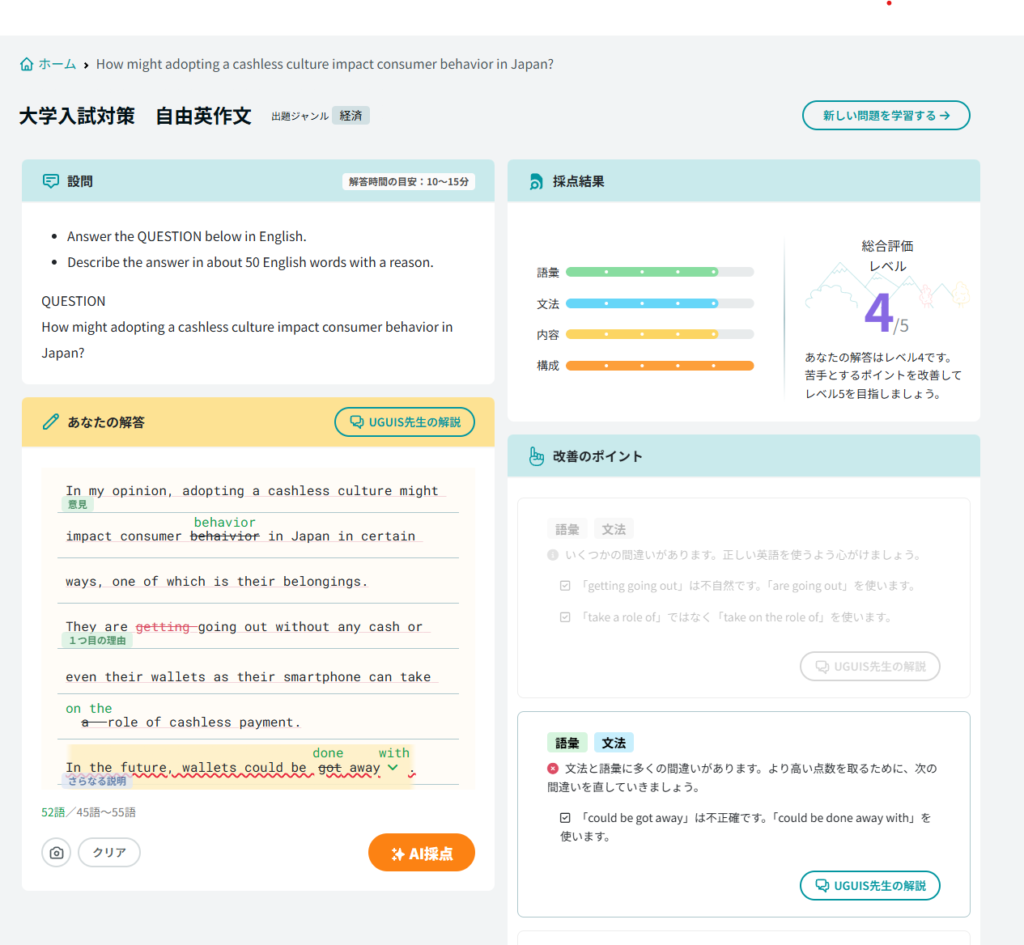 - AIによる自由英作文の即時添削: ChatGPTを活用した高度な自然言語処理により、文法修正だけでなく具体的なアドバイスや総合評価をリアルタイムで提供