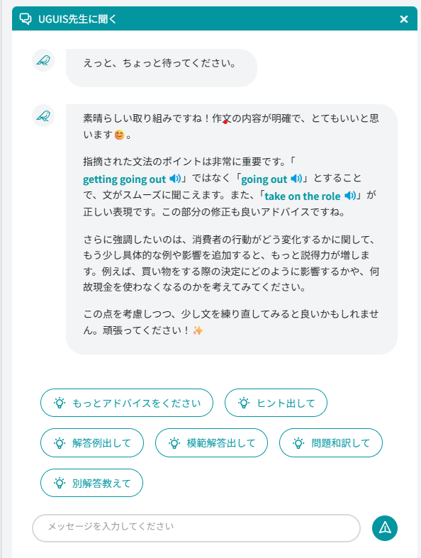 - 伴走型チャット「UGUIS先生」: 模範解答の提示やヒント、単語の意味などをチャット形式で質問でき、個別指導を受けているような感覚で疑問を解消できる